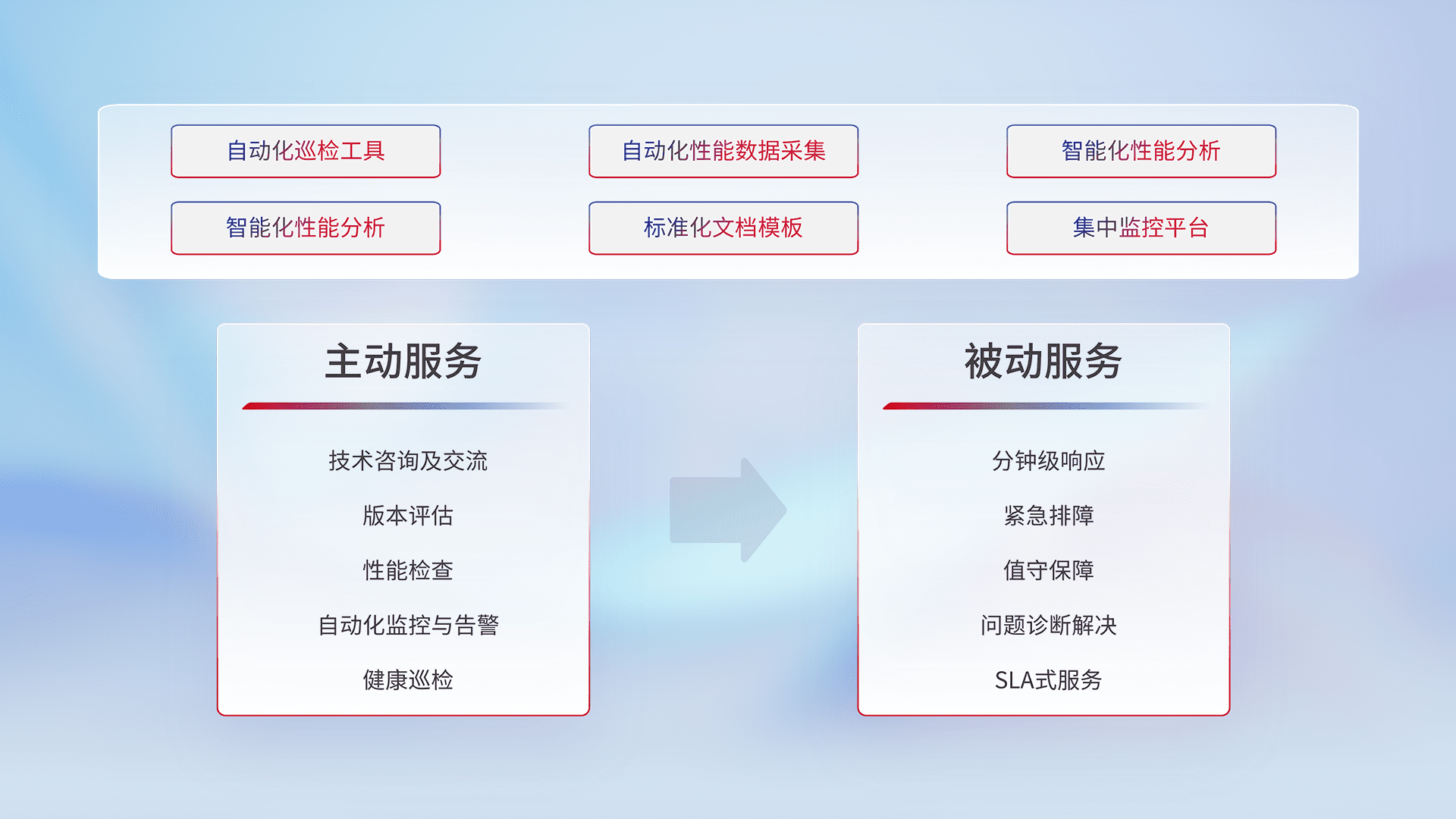 智能化工具和标准化文档,,,保障服务质量,,,提供主动服务(包含技术咨询、、、版本评估、、、、性能检查、、自动化监控与告警、、健康巡检)和被动服务包含(分钟级响应、、、、紧急排障、、、值守保障、、、问题诊断解决、、、、SLA服务)。。。。